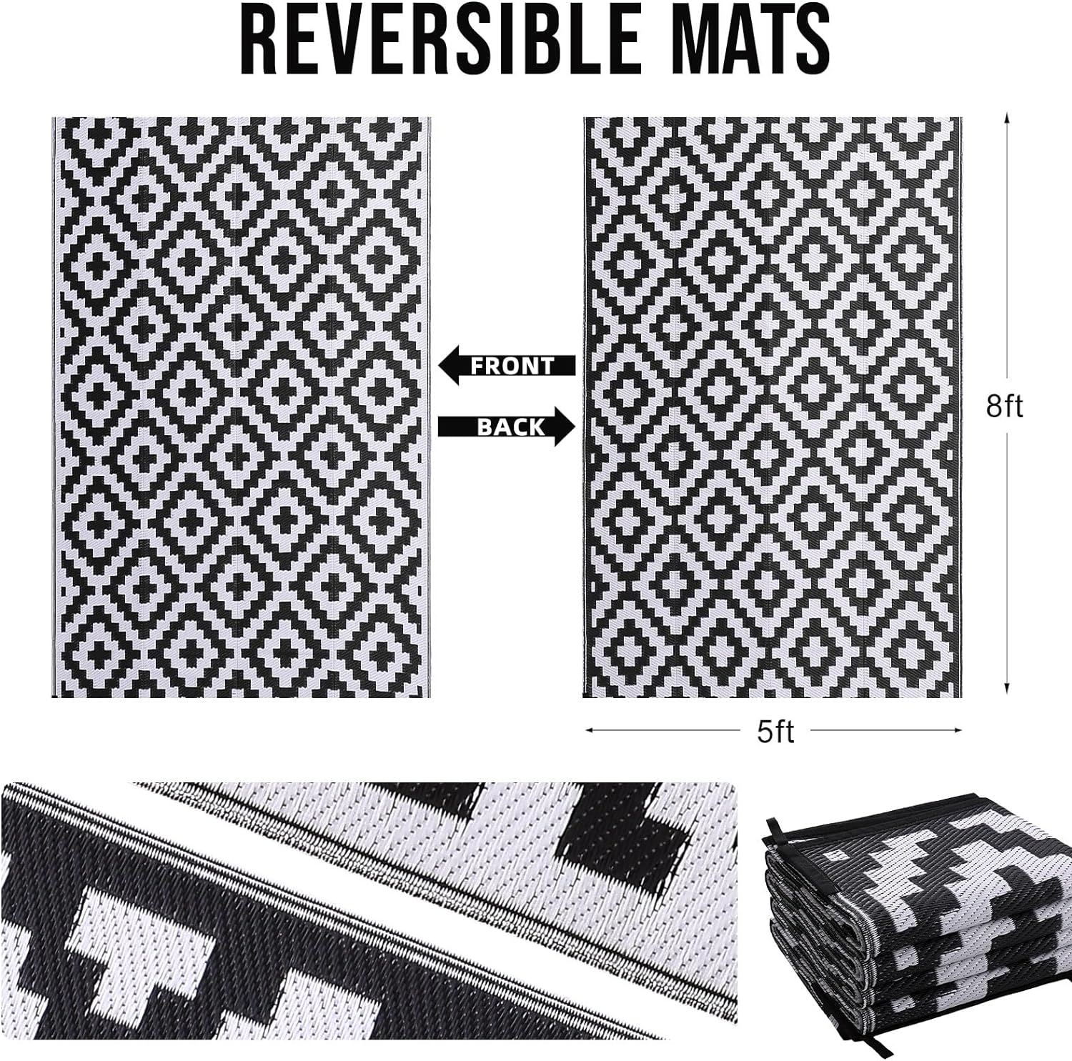 OLANLY Waterproof Outdoor Rug 5×8 ft, Reversible Plastic Straw Patio Rug for Camping, RV Mat Outside, Indoor Outdoor Carpet for Porch, Deck, Backyard, Camper, Balcony, Picnic, Black & White